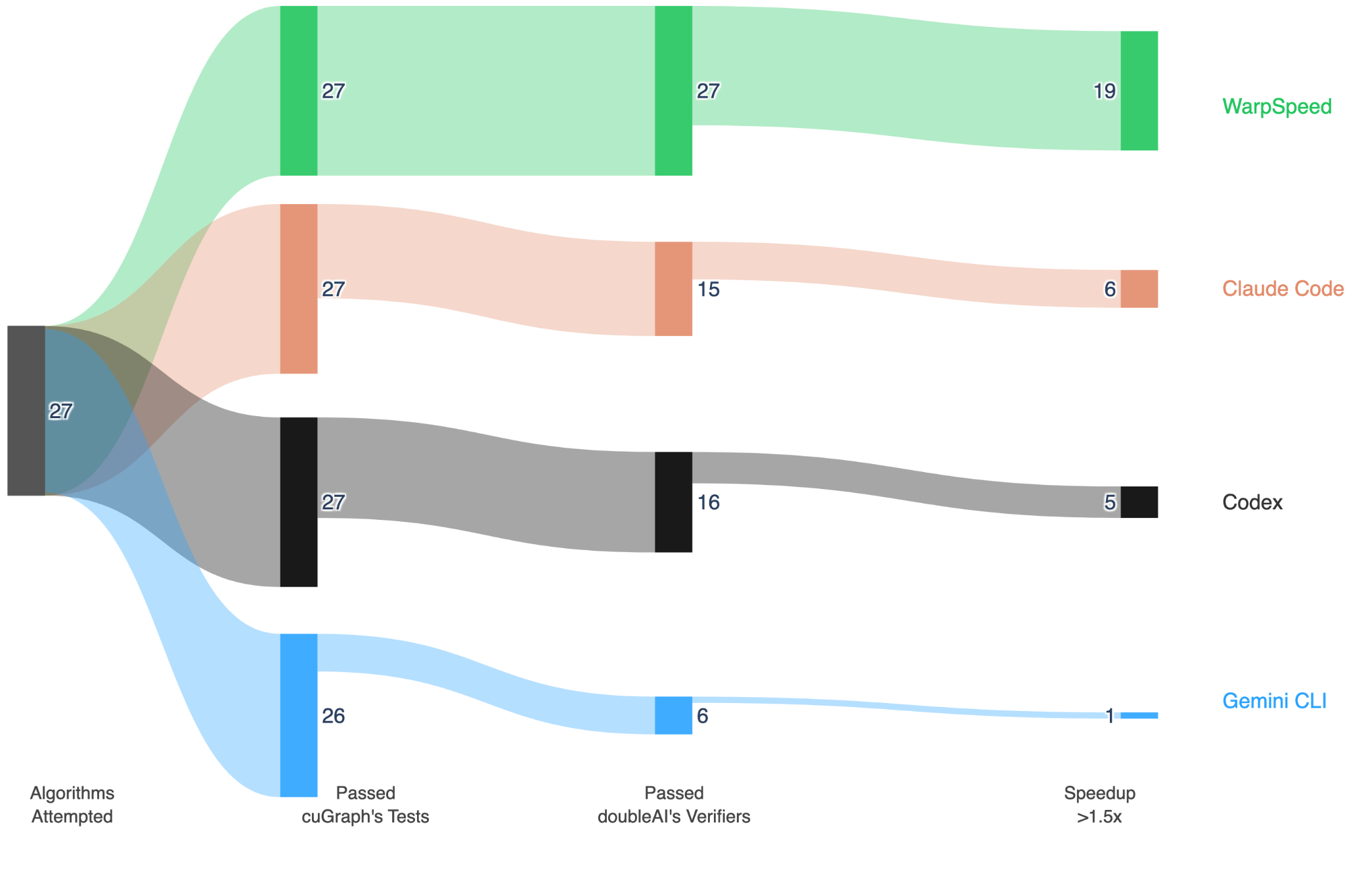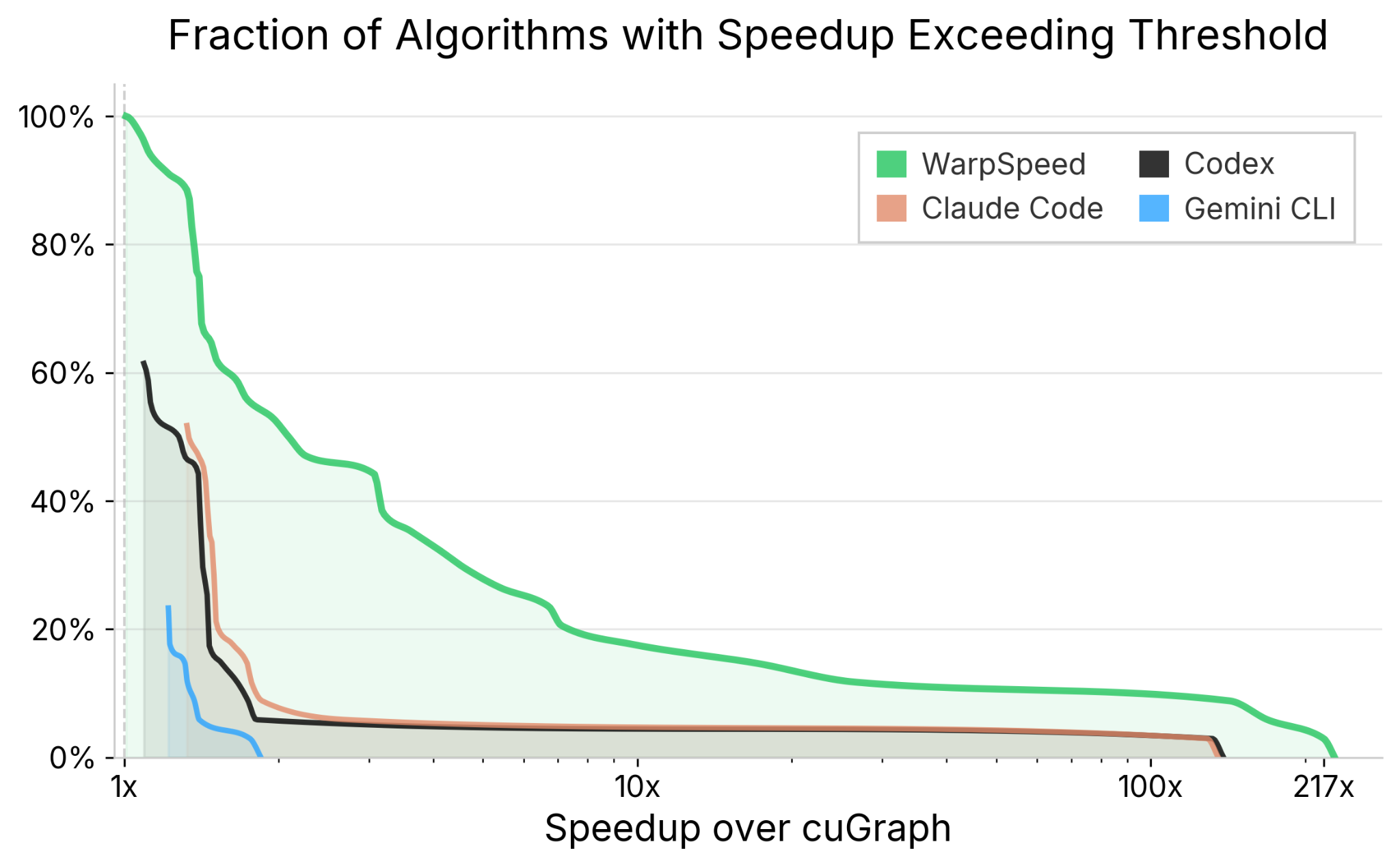 Claude Code and Codex each managed to produce correct implementations for 56% and 59% of algorithms, respectively, whereas Gemini CLI answered correctly only on 22% of algorithms. WarpSpeed, in contrast, produced a correct answer every single time.